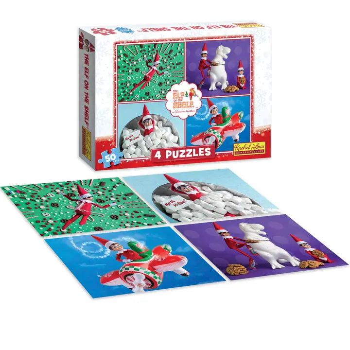 Includes four Elf on The Shelf large 50pc puzzles perfect for all children, ages 5 and up. All four puzzles have unique art, catching your favourite Scout Elves in Christmas action